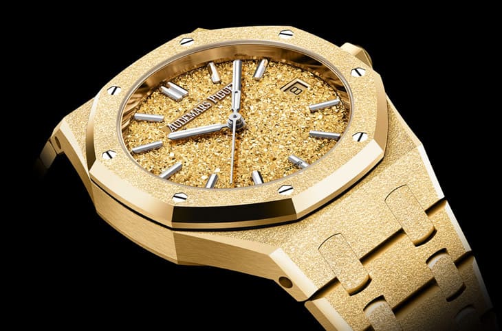 新款皇家橡樹霜金自動(dòng)表提供黃金與白金兩種款式,尺寸為34mm,適合不同佩戴者的喜好。表殼與表帶均采用霜金工藝修飾,展現(xiàn)出與眾不同的奢華感。