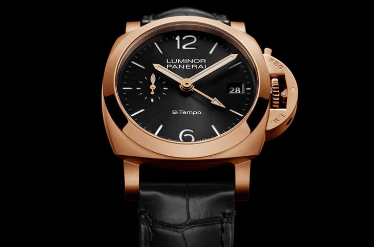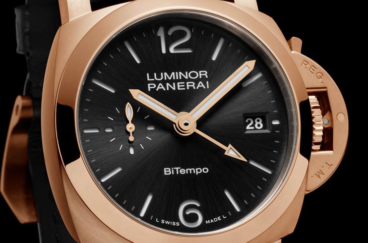 PANERAI沛納海Luminor系列的Quaranta BiTempo兩地時(shí)間款式難得出現(xiàn)貴金屬版本,品牌新發(fā)表的Luminor Quaranta? BiTempo Goldtech? PAM01641采用沛納海獨(dú)家紅金制作表殼,相較同系列、同功能作品先前往往以不銹鋼表殼為主的設(shè)計(jì)蛻變出更為高貴雅致的氣質(zhì)。