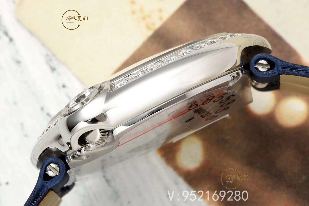 外觀設計 Ballon Blanc de Cartier系列腕表以其圓潤如氣球般的表殼設計而著稱。直徑30mm的表殼尺寸,完美平衡了女性的柔美與力量,適合各種手腕尺寸,展現出佩戴者的非凡氣質。表殼4時位置鑲嵌的明亮式切割鉆石,猶如夜空中最亮的星,成為整塊表最為點睛之筆。