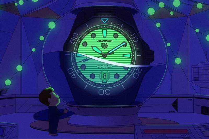 為了置身深潛水下而打造的Aquaracer Nightdiver夜?jié)撜咄蟊恚兄吭降囊归g讀時功能,片中由美國天才沖浪員Kai Lenny展示著表面夜光功能所閃爍的螢光色彩,模樣仿佛圣誕樹上點燈儀式,富有佳節(jié)氣氛。