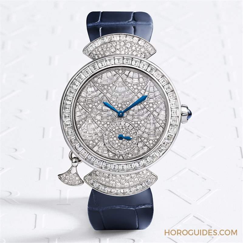 寶格麗是少數將女性風格帶入問表領域的品牌,Divina Mosaica Minute Repeater三問腕表這樣一款集頂級珠寶工藝與高級復雜功能于一體的珠寶問表,白K金表殼下,是飾以鉆石鑲嵌扇形圖騰的表盤,以及創下世界超薄紀錄的BVL362機芯。滑動位在8時位置的專用滑鈕,即可啟動二槌二簧報時機制。滑鈕綴以鉆石鑲嵌的扇形墜飾,表耳也以扇形造型展現,設計細節緊扣同一主題,細膩詮釋高級珠寶腕表的精致美感。
