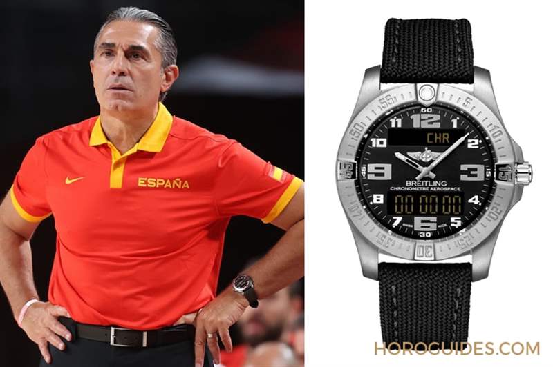 西班牙男籃教練Sergio Scariolo是個愛表人,現身賽場邊的身影常常配戴著不同的表,先前他曾被發現配戴著Audemars Piguet皇家橡樹離岸型腕表,這回在西班牙男籃國家隊擊敗日本隊的那場賽事上,一只Breitling Aerospace EVO腕表出在他插著腰的左手上。