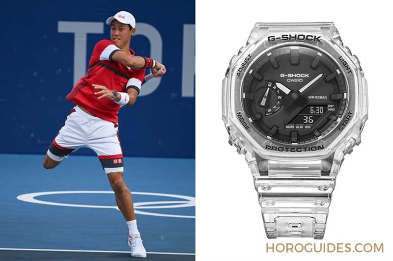 日本選手說好了一起以紅白配色亮相嗎?被認為是日本最強男網運動員的錦織圭,出賽時配戴著一只最近十分熱門的G-Shock GA2100SKE-7A,八角形表殼、透明表殼與表帶、搭配上黑色面盤,很青春也很有型。
