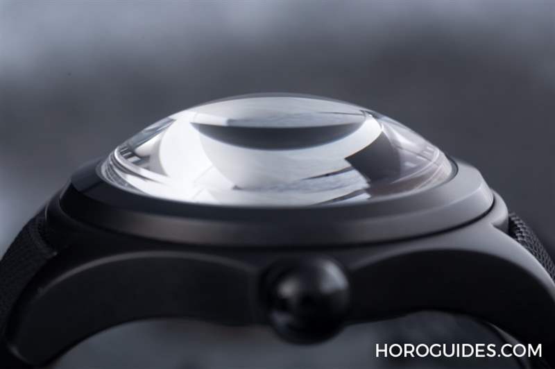 整體風(fēng)格獨特強烈,設(shè)計細(xì)節(jié)蘊藏巧思。表殼與表圈以施以黑色PVD涂層處理的不銹鋼打造,黑化風(fēng)格恰是表盤圖案最恰如其分的畫框,也更能凸顯出圓拱形藍(lán)寶石水晶鏡面的瑩潤剔透感。黑色半球形表冠的造型渾圓飽滿,與鏡面線條相互呼應(yīng)。