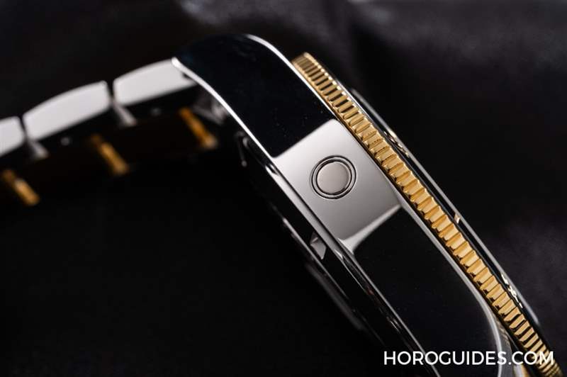 整體風(fēng)格陽剛俐落,細節(jié)到位。單向旋轉(zhuǎn)表圈邊緣乘鋸齒狀,既增加線條美感,同時可提高阻力以利旋動調(diào)整。表圈上的刻度與數(shù)字線條分明,配色對比,辨讀容易;其中藍面款的陶瓷外圈,呈現(xiàn)了藍、白、紅三種色澤,燒制程序更繁復(fù),制程難度更高。雙色金款則是利用金色PVD做出兩種精鋼呈色,表圈刻度與鋸齒邊緣、指針、時標邊緣、表冠也都以金色與三板鏈帶的金色中央鏈節(jié)相呼應(yīng)。