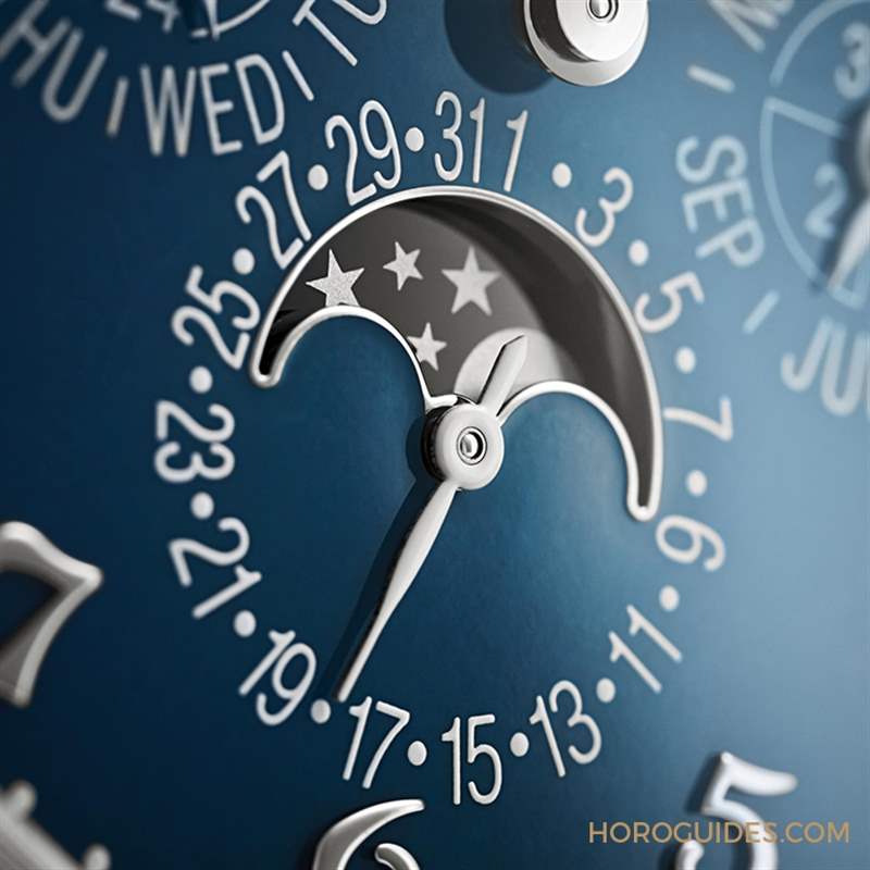 表款的復雜功能其一為萬年歷(星期、日期、月份及閏年)配合24小時顯示,透過三枚略為加大的附屬顯示盤展示相關資料。白金葉形指針添上夜光涂層,確保清晰可讀;白金鑲嵌琺瑯邊框令月相顯示倍顯突出。另外三問報時配備兩條「教堂鐘聲」音簧,音簧長度幾乎環繞機芯兩周,音色豐富透亮,經過百達翡麗總裁親自聆聽檢驗的報時樂音,更能滿足藏家挑剔的聽覺。