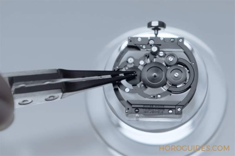 為實現機芯猶如懸浮在表殼中的概念,因此采用完全透明的藍寶石水晶來制作機芯三個主要部件–計時表橋、底板和齒輪表橋。要以堅硬的藍寶石水晶打造出這些厚度不超過1mm的纖薄部件,格外講究精雕細琢,相較于傳統自制機芯組裝工時約三天,Caliber 3.1機芯單是組裝便需歷時一周。