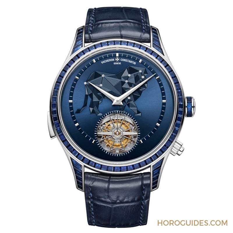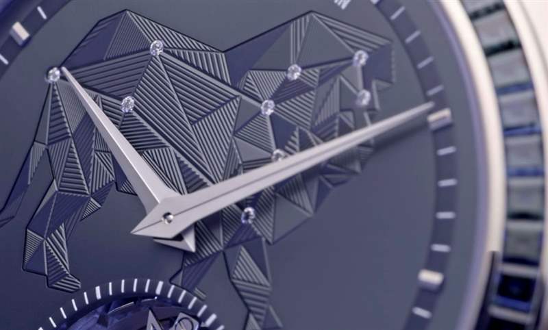 既然把目光投向了宇宙,自是不會遺漏了締造了諸多神話與傳說的星座;出現在夏季的獅子座,躍上「閣樓工匠三問報時陀飛輪星空圖獅子座珠寶表」表盤,為這款杰作定調出優雅的王者風范。江詩丹頓以三角形圖案機刻雕花,在乳光深藍色表盤上拼列成獅子輪廓,羅列其間的鉆石鑲嵌正是構成這個星座的恒星。表殼鑲嵌100顆梯形切割藍寶石,深藍的折射光燦與表盤相映生輝。