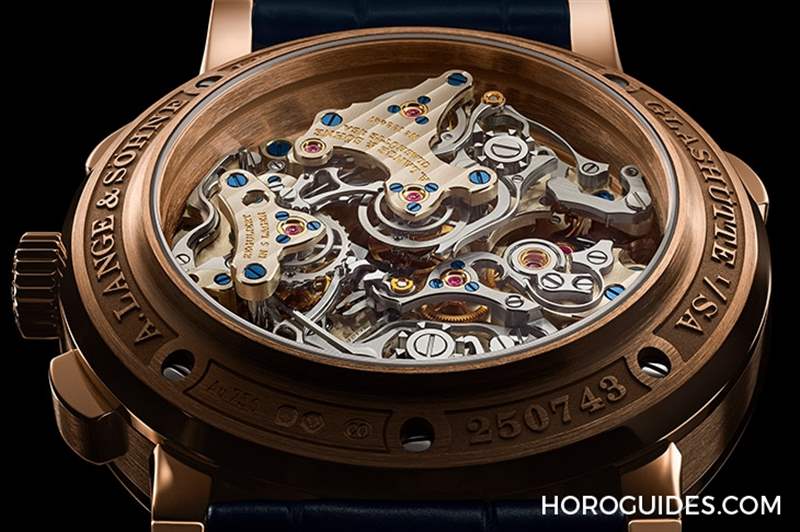 表款搭載L132.1手動上鏈機芯經過五方位精密調校,弧度優美的多枚夾板、杠桿零件,另外未經處理的德國銀所制作的夾板與橋板、手工雕刻擺輪夾板、藍鋼螺絲、黃金套筒等朗格機芯早就聞名遐邇的特色,讓這樣一款腕表不僅結構復雜,更美不勝收。
