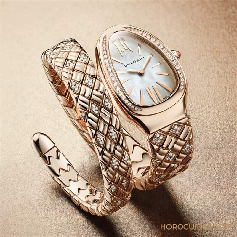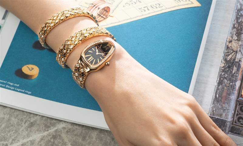 2021年全新Serpenti Spiga腕表包括白色珍珠母貝面盤的玫瑰金半鉆腕表單圈款、黑色漆面的玫瑰金半鉆腕表雙圈款與全鑲鉆珠寶腕表雙圈款;其中全鑲鉆頂級珠寶腕表,使用超過800顆鉆石,表冠鑲嵌1顆蛋面切割藍(lán)寶石,格外奢華奪目。