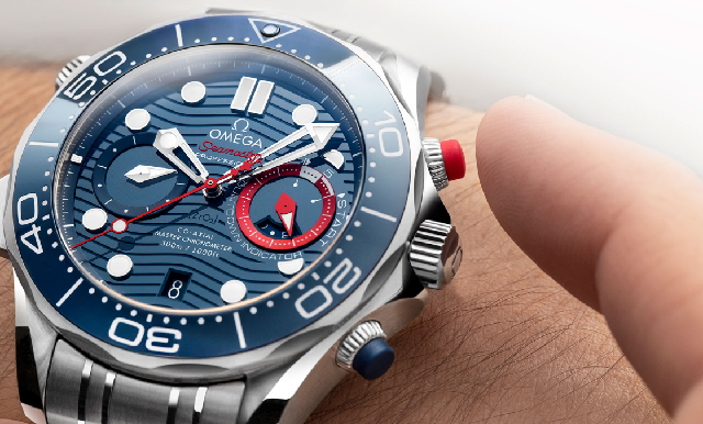 為確保在風(fēng)高浪急的極端環(huán)境下仍可輕易操作腕表,歐米茄特別在計時按把上配上橡膠材料,這符合人體功學(xué)的設(shè)計特別采用時尚的紅色及藍色色調(diào),即使在濕滑的情況下仍可容易操作。在鐳射蝕刻的波浪紋表面上綴有經(jīng)電導(dǎo)處理的紅色鋁質(zhì)帆船賽倒數(shù)計時圈,此小表盤底部設(shè)有一小時計時轉(zhuǎn)盤;而其經(jīng)電導(dǎo)處理的紅色分針及鍍銠小秒針的設(shè)計靈感則源自帆船船體形狀,呼應(yīng)腕表主題。
