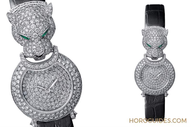 在La Panthère這款腕表上,Cartier把美洲豹最具神秘魅態的肢體語言,抽象化地化為柔順的鏈帶。落在貴金屬材質巴黎釘紋之間的黑色尖晶石金字塔象征美洲豹身上的美麗斑點,兩者銜接出一道曲線柔和的雙環設計,配戴起來十分舒適。與其說它是時計,不如將它視為一件帶有時間指示功能的珠寶,溫柔又饒富個性地蜷伏在配戴者手腕,閃閃發亮。