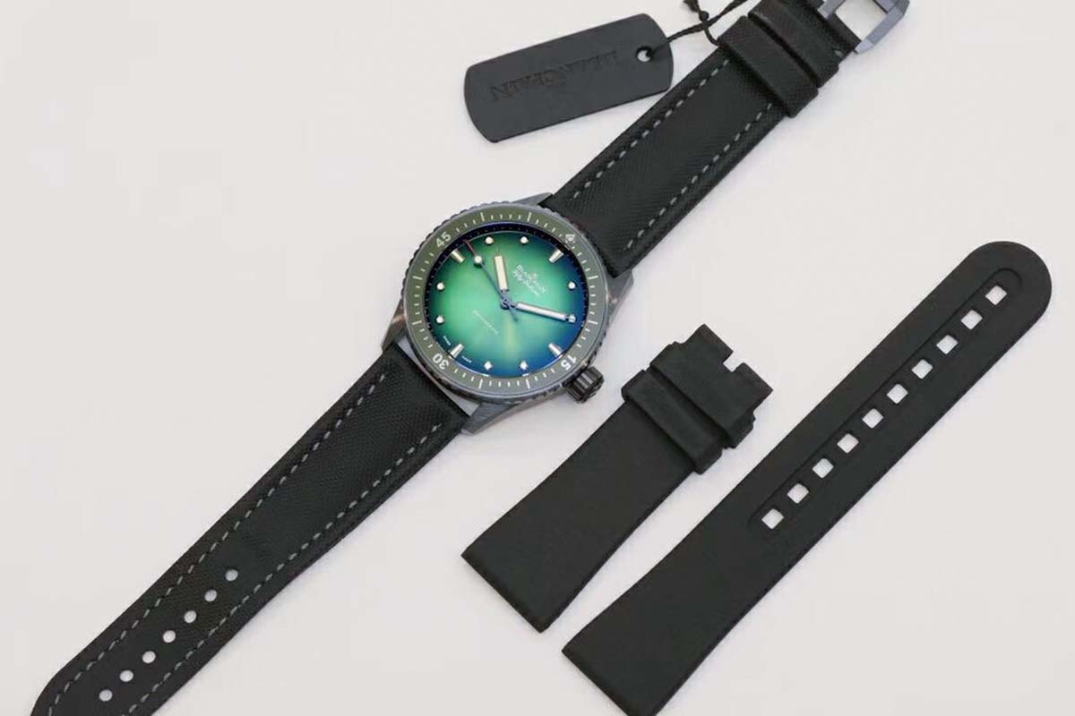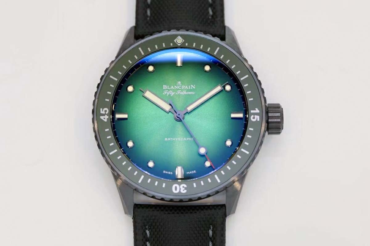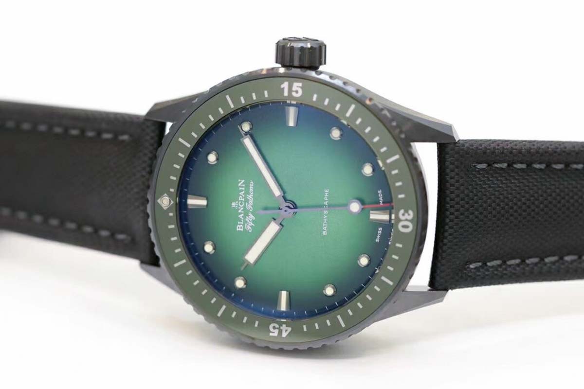 GF廠寶珀五十噚系列5005極光綠復(fù)刻腕表綠色表盤和綠色陶瓷表圈。綠色表盤配以磨砂綠色陶瓷表圈和比照鮮明的液態(tài)金屬分界,并配有寶珀黑色黑色北約表帶,與表殼的深色陶瓷外觀奇妙地調(diào)配在一起。12點方位的發(fā)光點索引是對1950年代原始五十Fat手表中運用的指針的忠實再現(xiàn)。表殼直徑43.6毫米與原裝共同,滿足了大部分男士手腕的佩帶需求。表殼由黑色陶瓷制成,帶有傾斜的表耳和緞面拉絲外表。