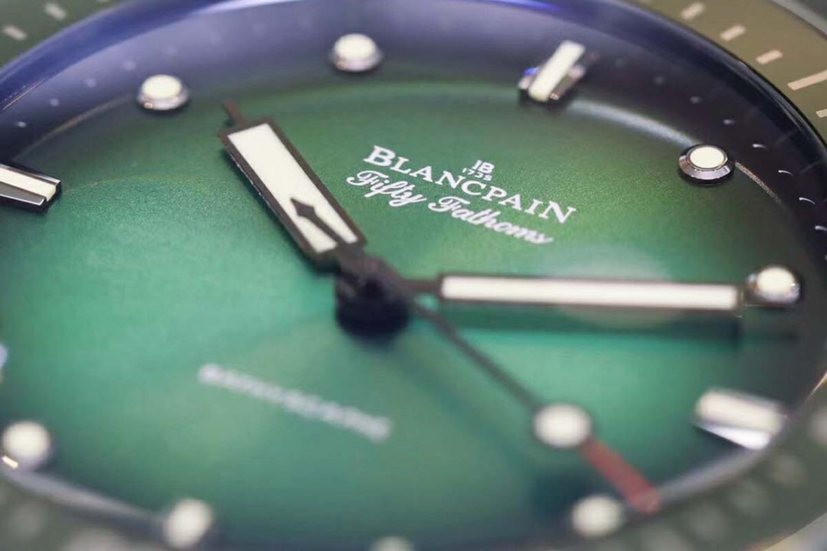 眾所周知五十噚的夜光效果特別棒!GF廠寶珀五十噚系列5005極光綠復(fù)刻腕表表盤12點位下方的Logo部分并沒有呈現(xiàn)毛刺,或者堆疊的現(xiàn)象。簡略的大三針規(guī)劃,給這款腕表增添了不少魅力。最長指針為秒針,前端增添了一抹亮紅,并且圓環(huán)的地方進(jìn)行了夜光的填充。兩根粗胖的指針是分針與時針,也都是非常用心的填充了夜光資料,使得此腕表在黑私自也仍然能夠明晰精確地讀取時刻。