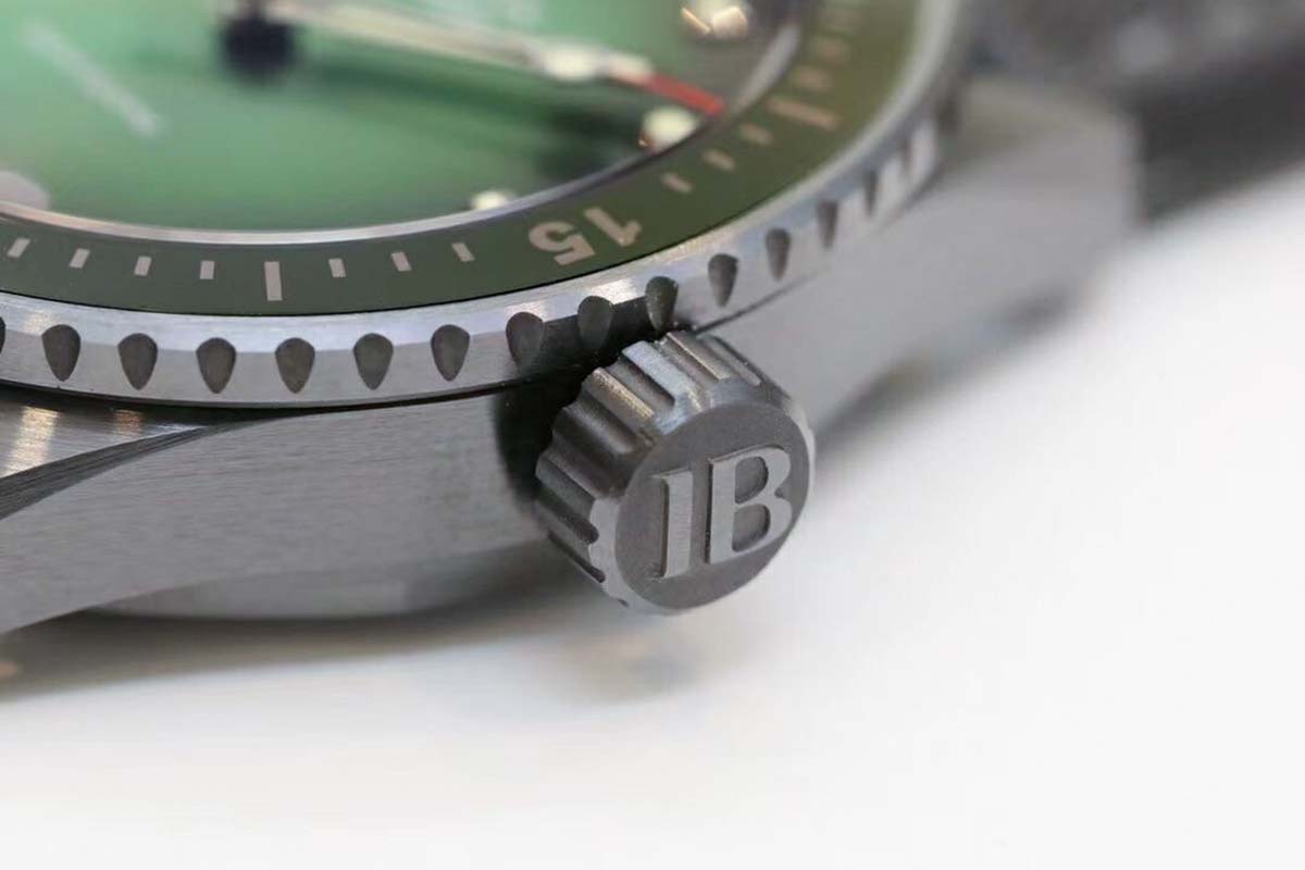 GF廠寶珀五十噚系列5005極光綠復(fù)刻腕表表冠選用三角坑紋規(guī)劃,防滑的同時愈加便利調(diào)時刻,非常便捷。頂端鑲刻了寶珀“JB”logo,極具立體感,展示品牌風(fēng)范。