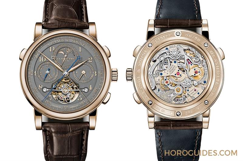 朗格本次新作中的最復雜表款Tourbograph Perpetual Honeygold,具備五大復雜功能,包括陀飛輪、萬年歷、芝麻鏈系統、計時和追針,表徑43mm,刻度圈、主表盤以及另外三個小表盤的高度各異,展現五件式表盤構造,同時采用立體的Honeygold材質的字樣與刻度,以0.15mm的高度浮出表盤,使面盤呈現出精致細膩的立體感,表盤與數字皆經過黑色鍍銠處理,元素更鮮明。