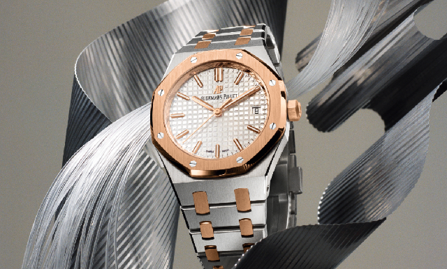 兩款精鋼表款搭配銀色調或藍灰色調「Grande Tapisserie」表盤。藍灰色調表款飾有鑲鉆表圈。愛彼也呈現一款優雅的雙色調表款,結合精鋼表殼和表帶與18K玫瑰金表圈和表帶連接片。此表款搭配銀色調「Grande Tapisserie」表盤。