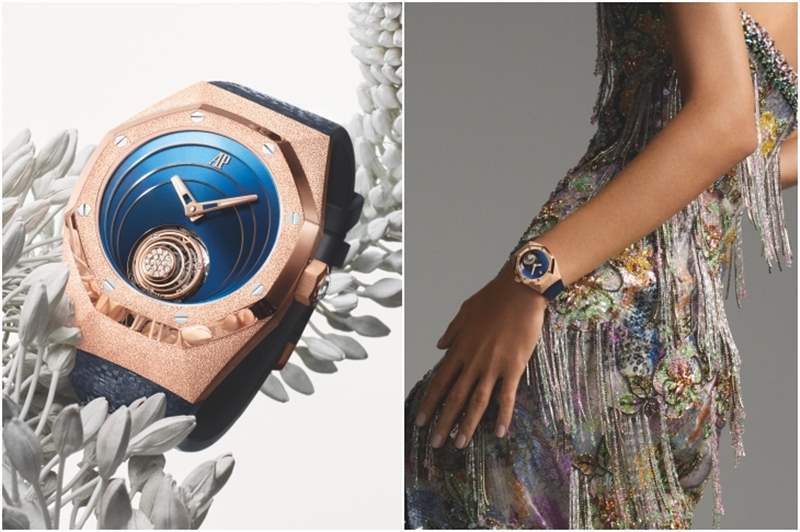 Ralph&Russo也透過全新時裝系列重新詮釋皇家橡樹概念系列飛行陀飛輪腕表,皇家橡樹概念表款的精致女性美學與復雜微機械的交織,進一步突顯服飾特色。