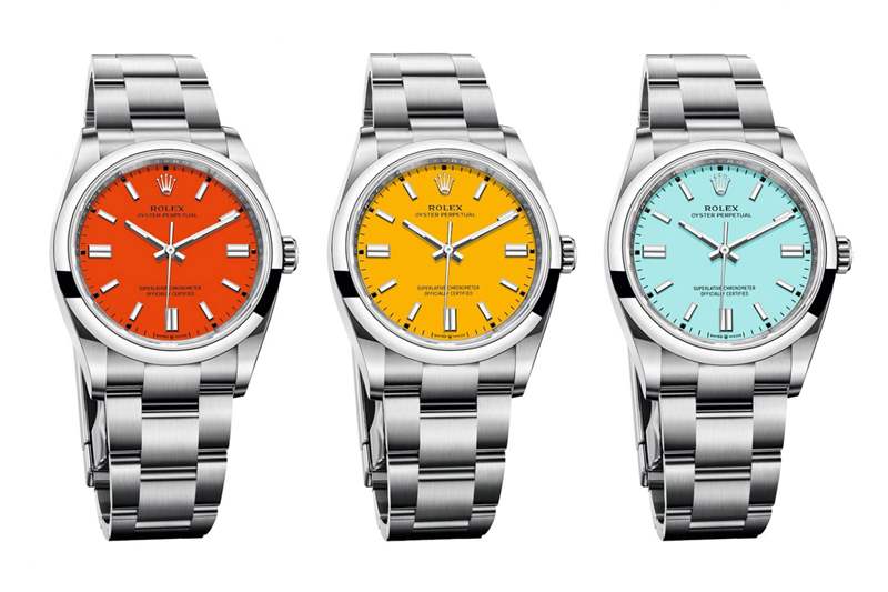 勞力士蠔式恒動珊瑚紅(31 毫米、36 毫米、41 毫米)、黃色(31 毫米、36 毫米、41 毫米)和綠松石色表盤(41 毫米)