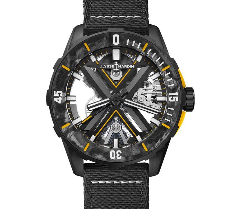 這款雅典表發動機采用直徑44毫米的鈦金屬表殼,并涂有黑色DLC。這種輕金屬與刻度表圈的Carbonium?相輔相成,刻度表圈是一種源自航空的耐腐蝕材料,由壓縮碳纖維組成。Diver x 骷髏黑 配有兩條表帶,一條采用黃色橡膠制成,搭配折疊式表扣,打造運動風和咬人身份,另一條由回收漁網制成,帶有一種魔術貼?(R-Strap)開合,具有(幾乎)全黑色的外觀。