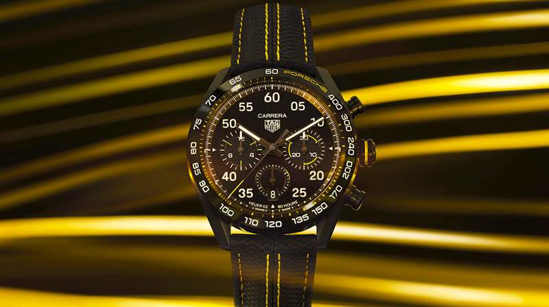 這個雙色構(gòu)圖是用黃色的破折號襯托的。彩色滾邊在表冠上綻放,固定表圈的測速刻度、累加器之一以及紋理黑色小牛皮表帶上的過度縫合。黃色還凸顯了由168個組件組裝而成的Heuer 02自動上鏈機(jī)芯(動力儲存80小時)的導(dǎo)柱輪。藍(lán)寶石水晶玻璃表背令人贊嘆于風(fēng)格化的擺陀,描繪出三輻方向盤。
