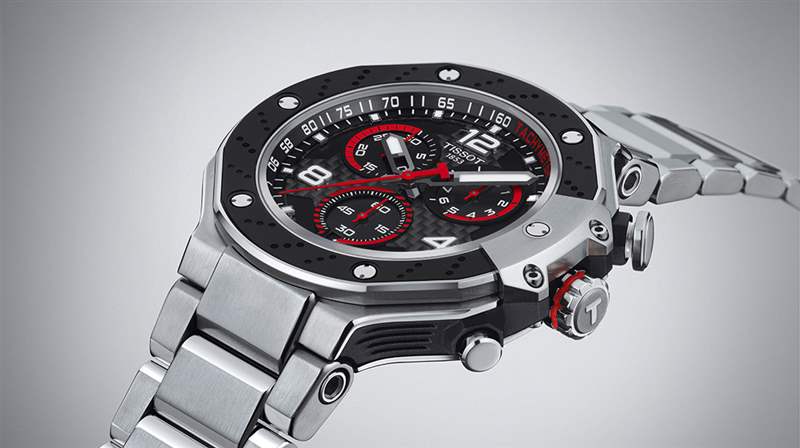 帶有紅色指針的計時盤以陰郁的場景布置在結構化表盤上。這種相同的顏色使快速的秒針著裝。從而獲得的對比度使構圖充滿活力。為獲得最佳清晰度,數(shù)字、時針和分針均涂有Super-Luminova涂層?。這款腕表搭載45小時動力儲存的自動上鏈機芯,透過藍寶石表背,其裝飾的擺陀清晰可見。該型號配有穿孔皮革腕帶,具有運動外觀。T-Race Moto GP Quartz和T-Race Marc Márquez分別生產(chǎn)8,000件和3,993件,采用石英機芯,集成在相同直徑的相同表殼中。它們都配備了金屬腕帶。但是,它們在表盤方面彼此不同。第一款采用碳纖維設計,采用運動型布局。第二個帶有西班牙世界冠軍的顏色。無論型號如何,每個都有自己的頭盔形外殼。
