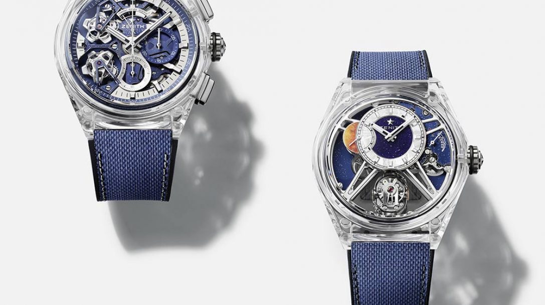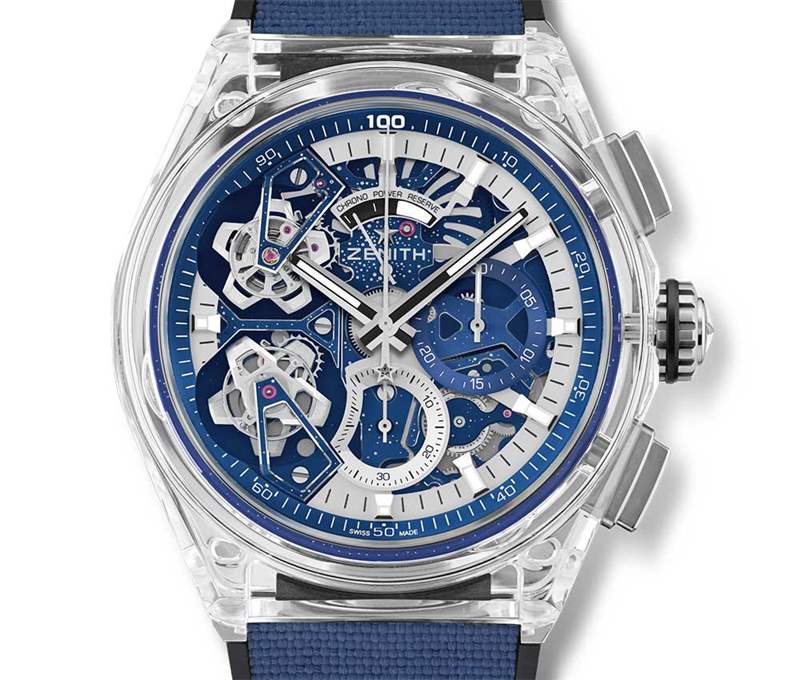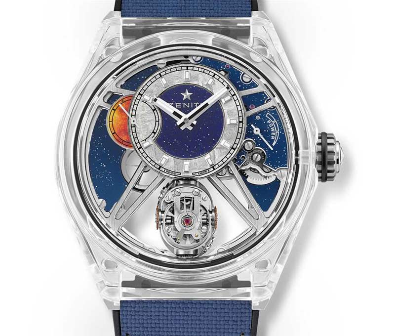 我們怎能不被這些由真力時精心編排的機械芭蕾舞劇所震撼呢?Le Locle的品牌為這些直徑46毫米的表殼選擇了兩款最精致的當代作品,這些表殼完全由藍寶石制成,彰顯了其吸引高級制表界的能力。最初的Defy Zero G模型將我們帶入了一個建筑占主導地位的領域。它有點精簡的升級喚起了空間。因此,其完全鏤空的手動上鏈El Primero 8812 S機芯和位于6點鐘位置的重力控制模塊與隕石和砂金石制成的小表盤相結合。在這款星際裝飾中,我們發現了偏心的時針和分鐘盤,10點鐘位置的小秒針和2點鐘位置的動力儲存指示器。