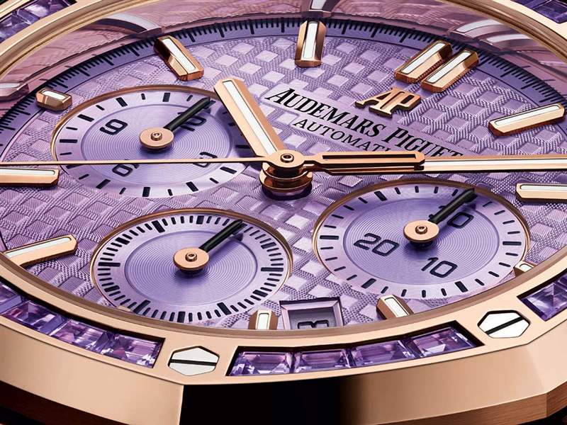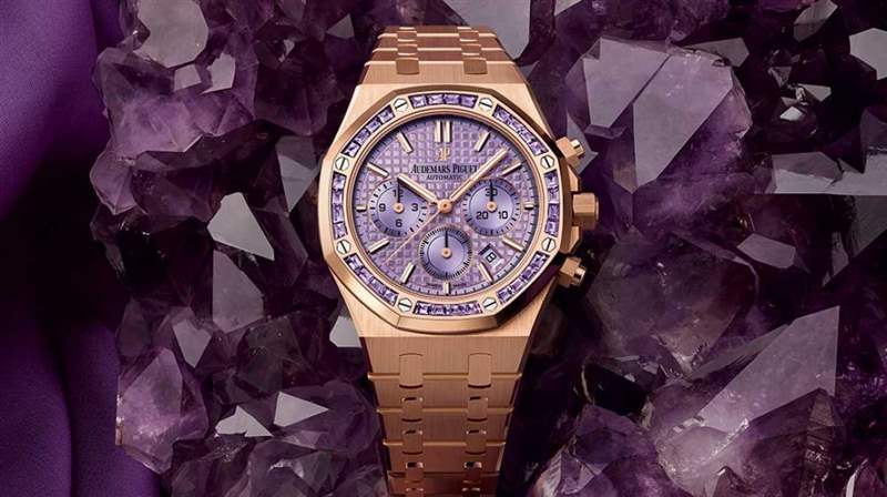 在巖石療法中,紫水晶被認為是一種強大的寶石,具有很強的凈化特性,可以舒緩心靈,平息焦慮,從而有利于夢想,想象力和直覺。除了經過近兩年的大流行后必不可少的有益屬性外,這種礦物還具有無與倫比的光彩,在柔和的淡紫色和強烈的粉紅色之間擺動,有時帶有藍色的暗示,出現(xiàn)在新款Royal Oak自動計時碼表的表圈上,這是愛彼于2019年首次推出的表款。因此,這顆紫水晶內襯著 32 顆約 2.85 克拉的長方形切割紫水晶,每排四顆,中間點綴著著名的平頭螺絲。