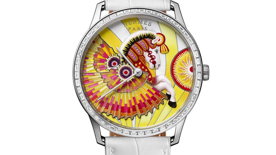 就像馬的標(biāo)志一樣,顏色是愛馬仕個性不可或缺的一部分,巴黎品牌發(fā)行的每件作品,跨越所有領(lǐng)域,始終是一場奢華的視覺盛宴。這幅插圖是一場真正的煙花匯演,由39歲的藝術(shù)家皮埃爾·瑪麗(Pierre Marie)想象,他自稱是“設(shè)計師裝飾家”,從為之創(chuàng)作的絲巾到手腕,它的路線一直很遠(yuǎn)。因此,這匹來自希臘神話的著名白馬,現(xiàn)在被換乘到兩個Slim La Source de Pégase的表盤上,在彩色陀飛輪中飛行。