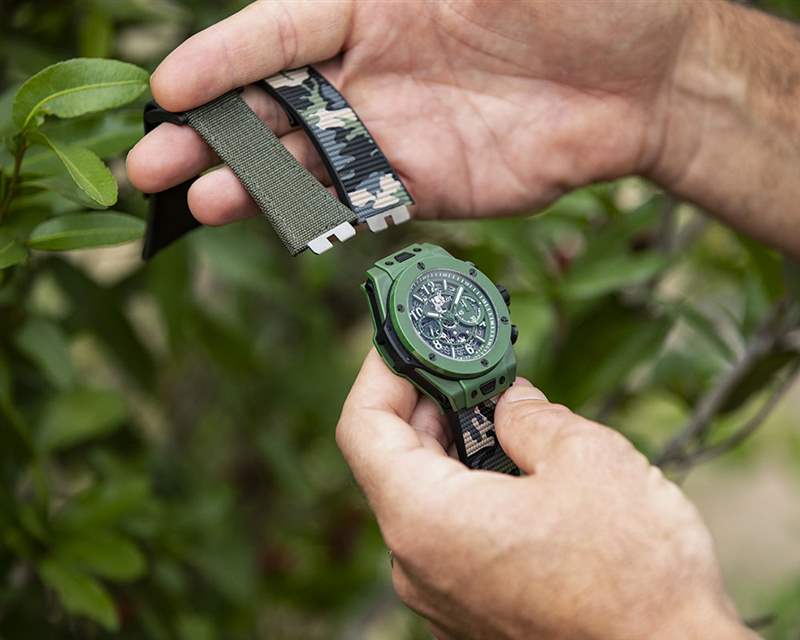 Big Bang Unico Sorai配有兩條帶子。一種是用與表盤匹配的顏色制成的紡織品。另一款黑色橡膠表款飾有迷彩圖案,搭配鈦金屬和陶瓷折疊式表扣。