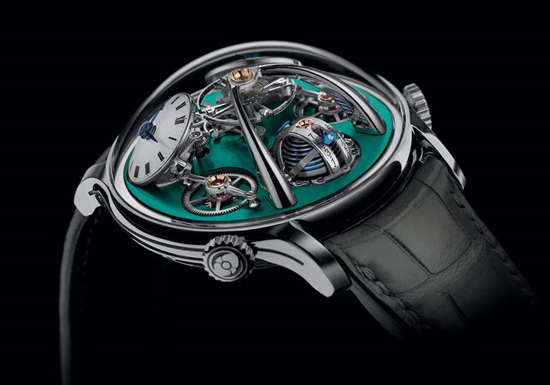 手動上鏈機芯的三個可見發條盒位于腕表兩側,鑲嵌在直徑為44毫米的表殼中。限量推出兩個系列。LM X RG以18枚發行,將玫瑰金表殼與橋板和涂有黑色NAC的圓盤相結合。另一款是LM X TI,以33件形式推出,融合了鈦金屬和綠色CVD表面。