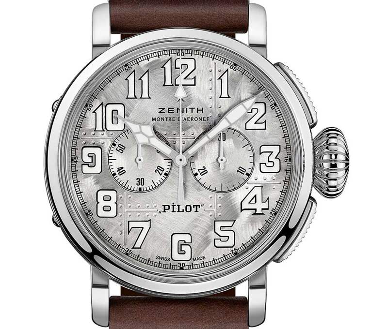 飛行員20型銀色計時碼表搭載El Primero 4069自動上鏈機芯,以5赫茲頻率振動,動力儲存50小時,搭配天然小牛皮表帶,飾有兩個鉚接表片。