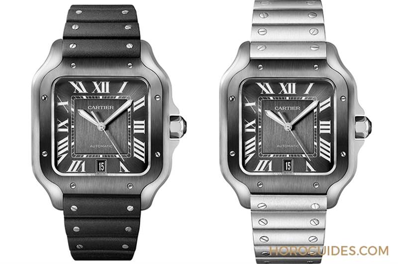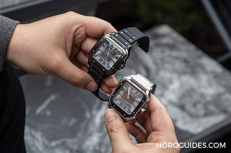 很特別的是這邊這一款配上的是黑色膠帶跟黑色皮帶,我覺得這個本身風(fēng)格比較強烈一點,當(dāng)然膠帶你平常它是一只運動表,你使用上膠帶比較方便,有需要的時候把它沖一沖,可能有時候氣候比較悶熱,你戴了有流汗的時候,卡地亞Santos 防水100米絕對沒有問題,配上膠帶,它本身屬于比較帥氣的風(fēng)格、全黑的,它附的是一條皮帶,所以有時候你要在一些打扮比較正式的時候,它也會很適合地展現(xiàn)出一種很不同的風(fēng)格。
