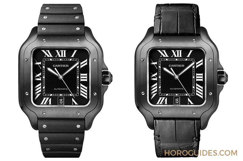 這邊有兩只我剛講的我非常心動的全新2020新的作品,一只是全表殼鍍黑、配上鏈帶,再加上黑色面盤、白色的羅馬數(shù)字,它把卡地亞非常經(jīng)典,一般是白色底、黑色字,這種很干凈、很經(jīng)典、偏比較斯文正式一點的,把它顏色整個反過來以后,就突然變得很強烈的面盤,黑色面加上白色的字加上全鍍黑的表殼,配上卡地亞最新款的膠帶,就是非常帥,你戴上去的時候,黑色跟膠帶跟新的面盤是非常成功的搭配,它也是第一次在卡地亞著名的龍頭藍寶石,為了保持全黑的All Black Look,把它換成黑色的寶石。