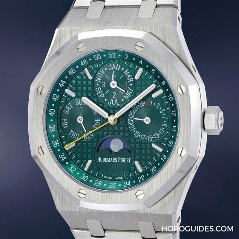 通常愛彼除了ROO計時特別版之外,二手行情坦白說屬于平平,不過這次出現(xiàn)了非常亮眼的例子,例如這款綠面的RO萬年歷是為香港譽(yù)一鐘表推出的特別版,限量50只,是地區(qū)、數(shù)量與店鋪的三重限量,難怪受到藏家追捧。