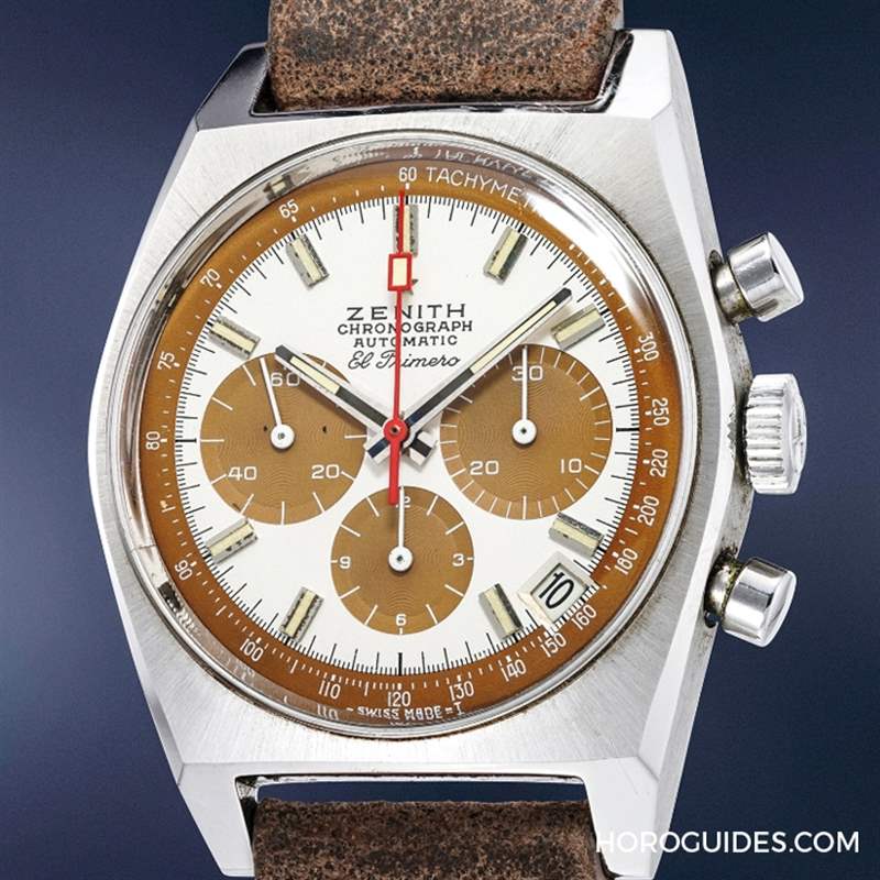 ZENITH的El Primero在表界自然有其重要地位,而這款El Primero SP 1301是El Primero系列早期的版本,計時表盤以及面盤外緣的測速環(huán)都已經(jīng)氧化,Tropical熱帶面呈現(xiàn)美麗的棕色,甚至是接近更淺的核果色,色調(diào)均勻,表徑37mm,