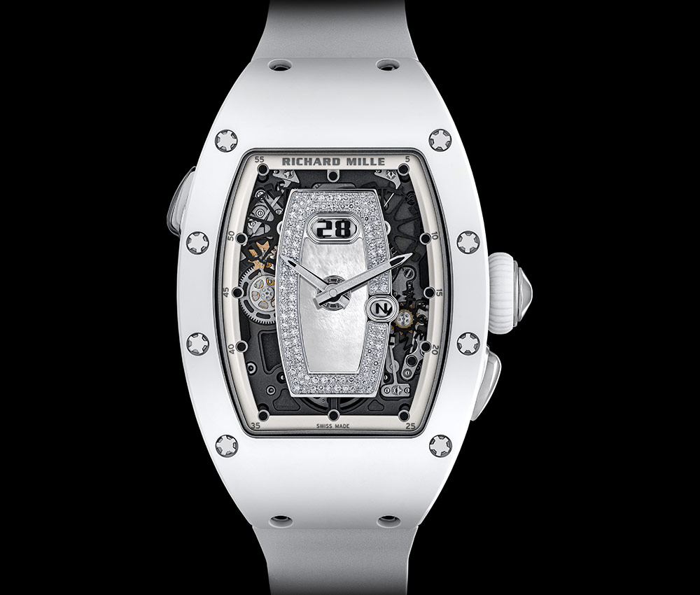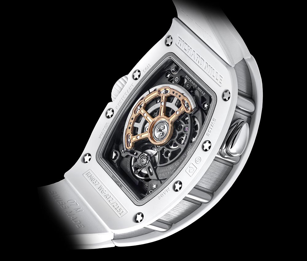 與該制表品牌的許多其他型號一樣,RM 037白色陶瓷自動腕表搭配舒適搭配的橡膠表帶。