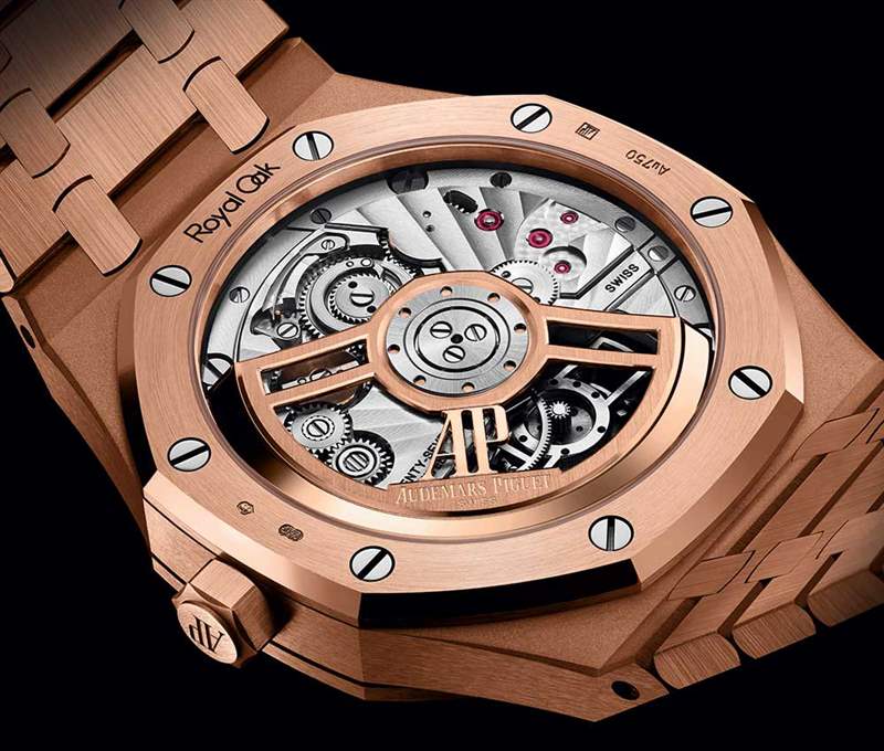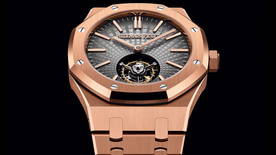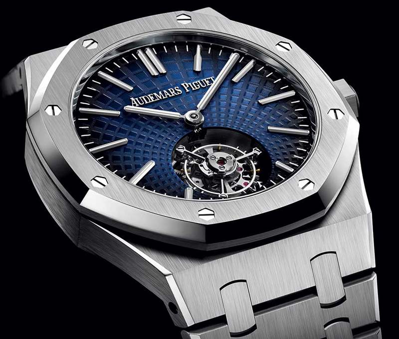 三枚皇家橡樹自動上鏈飛行陀飛輪腕表搭配完美整合的表鏈,采用與表殼相同的材質。這三重奏的風格更加增強,手工制作的飾面交替進行緞面刷洗和拋光,展現出啞光和光澤的一面,這已成為愛彼的標志性元素之一。