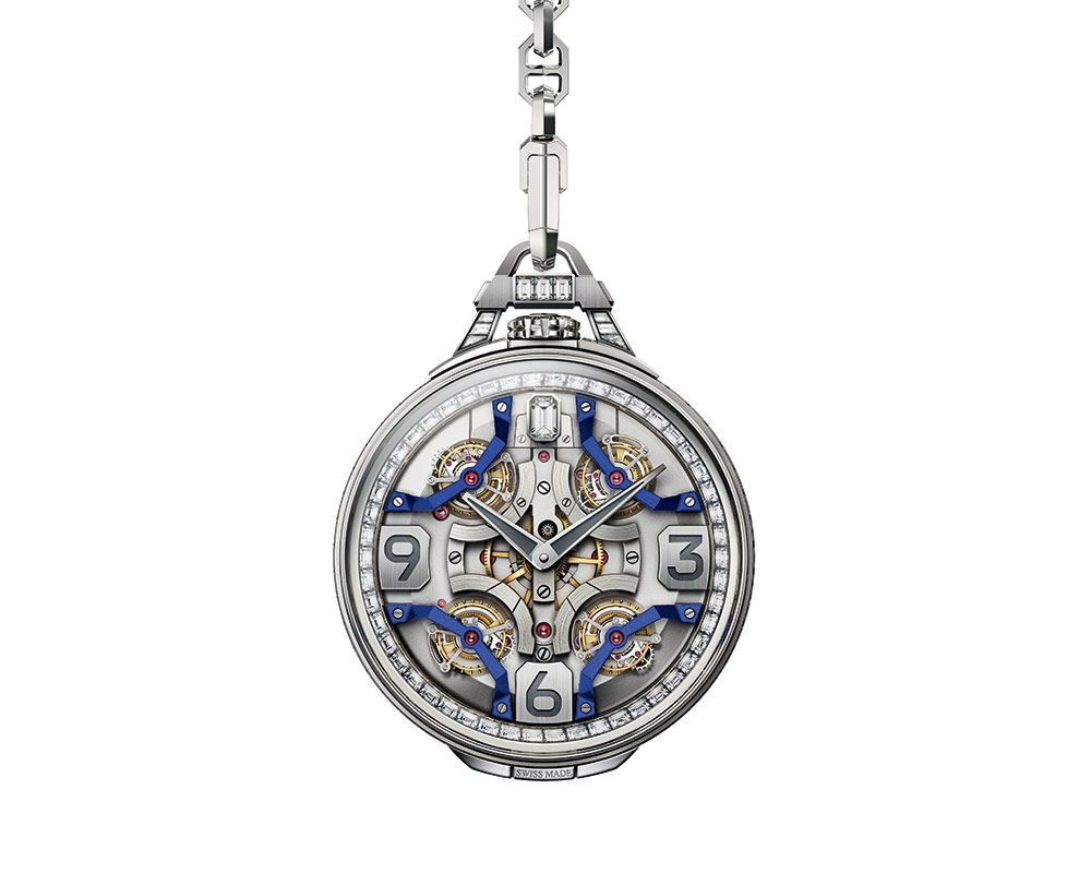 而且,這枚時(shí)計(jì),就像一件高級(jí)珠寶一樣工作,現(xiàn)在像一千顆星星一樣耀眼。表緣和直徑57.2毫米的白金表殼的邊緣鑲嵌著254顆長(zhǎng)階梯形切割鉆石!這些寶石的閃耀凸顯了鏤空表盤及其迷人的場(chǎng)景。在明亮的藍(lán)色鈦金屬橋板下,四個(gè)陀飛輪像旋轉(zhuǎn)的苦行僧一樣旋轉(zhuǎn)。阿拉伯?dāng)?shù)字3、6和9以其較淺的天藍(lán)色調(diào)和凸起的位置脫穎而出。部分橋板和圓盤的飾面營(yíng)造出微妙的浮雕設(shè)計(jì)。而且,這個(gè)活生生的展覽的亮點(diǎn)是一顆祖母綠式切工鉆石,在12點(diǎn)鐘位置的這個(gè)令人驚嘆的場(chǎng)景中占據(jù)著至高無(wú)上的地位。